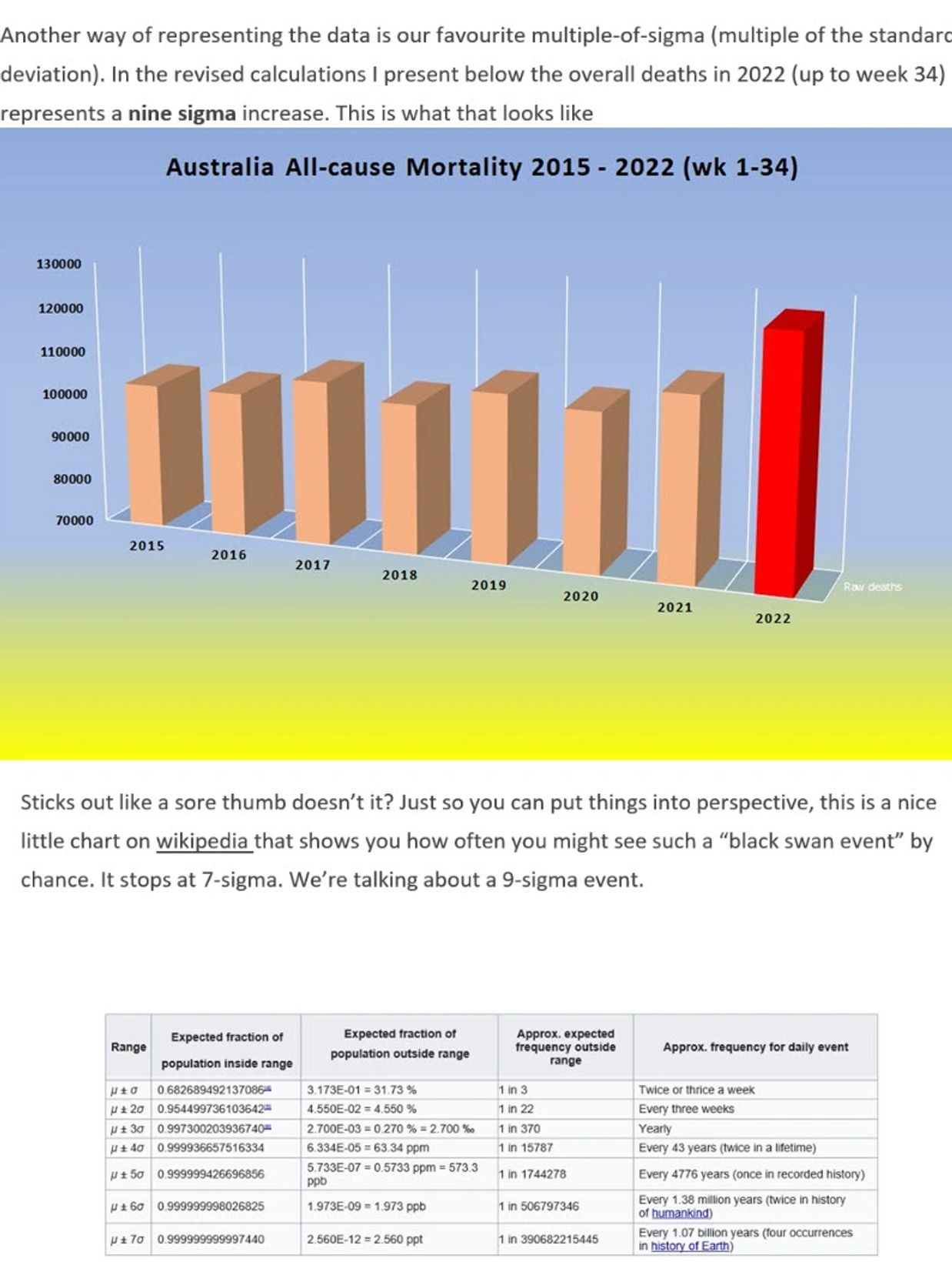 Since the vaccine roll out excess deaths that normally would not be there are through the roof. This is on top of all the massive increases in cancers, dementia, neonatal and cardiac issues...This has to be looked into and the vaccine must now stop before we go too far. The chances of these number are MORE than happening once in a billion years, using the SIGMA calculation theory. See below.